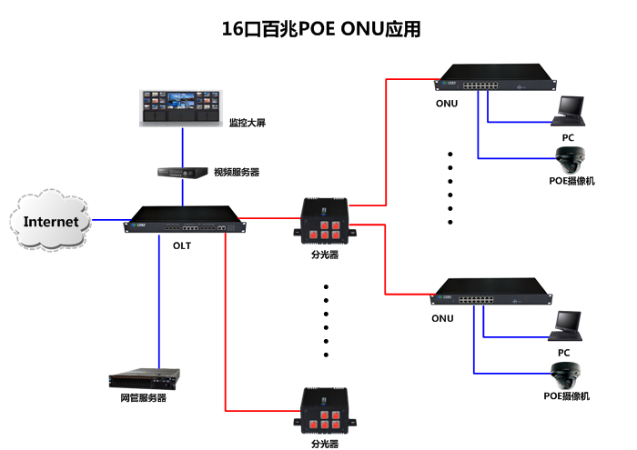 XC-E8016U-NP是一款EPON上行,16個百兆電口具有POE供電功能的專為安防設計的POE ONU。 該ONU能為用戶直接提供IP數據的接入,它基于成熟穩定、高性價比的EPON技術,提供一個PON接口,16個10/100M自適應電接口。采用單纖波分復用技術(下行1490nm,上行1310nm),僅需一根光纖和OLT相連,最高傳輸距離可達20 公里,支持掉電上報功能。16個POE電口具有自動檢測與識別符合IEEE 802 af/at標準的PD設備并為其供電的功能,因而不需要去擔心會損壞私有標準的PoE或非PoE設備,是經濟的使用PoE部署無線訪問點(AP)和基于IP的網絡監控攝像頭的小型商業網絡的理想選擇,可以有效解決維護繁瑣、無線覆蓋、終端設備取電、安防監控工程長的問題,最大限度的節約了工程成本。