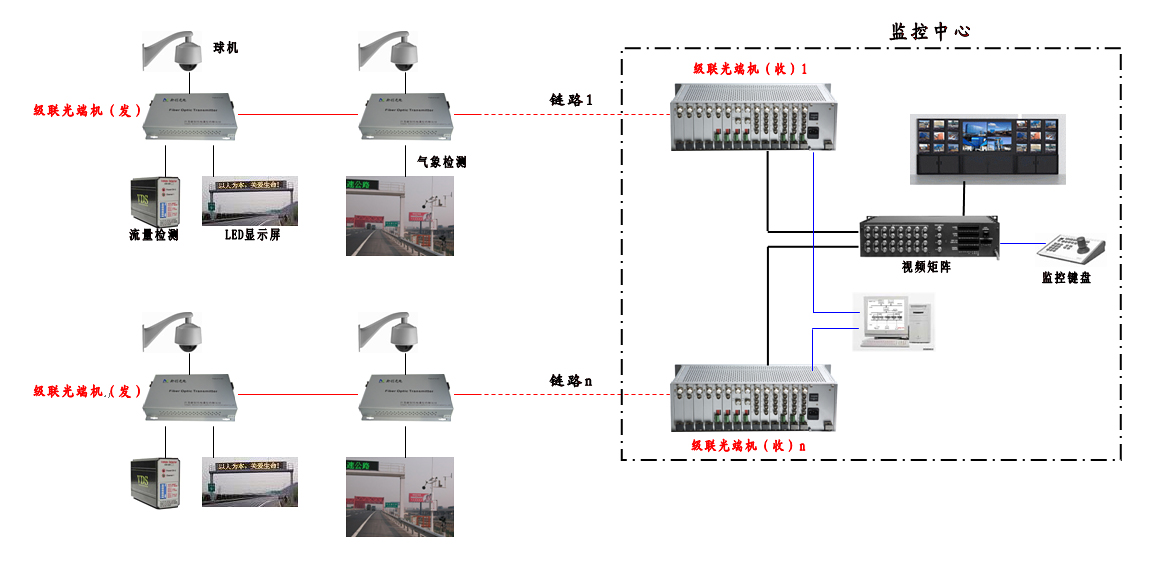 高速公路路段監控的特點是距離遠、光纖資源少,一般采用總線級聯光端機,用于視頻信號、控制數據、流量檢測信息、氣象監測數據、LED顯示信息等信號的傳輸。