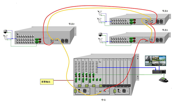 下圖為光纖冗余光端機用于國外某隧道的應(yīng)用方案,由于有兩路相互冗余的環(huán)狀光纖網(wǎng),當(dāng)其中一個環(huán)網(wǎng)的光纖斷了時,另外一個光纖環(huán)網(wǎng)繼續(xù)以單環(huán)光纖網(wǎng)通信,切換時間為零,大大增加了系統(tǒng)光纖通信的可靠性。 同時,光纖冗余光端機還有雙電源備份功能,從而大大地提高了系統(tǒng)的穩(wěn)定性、可靠性。