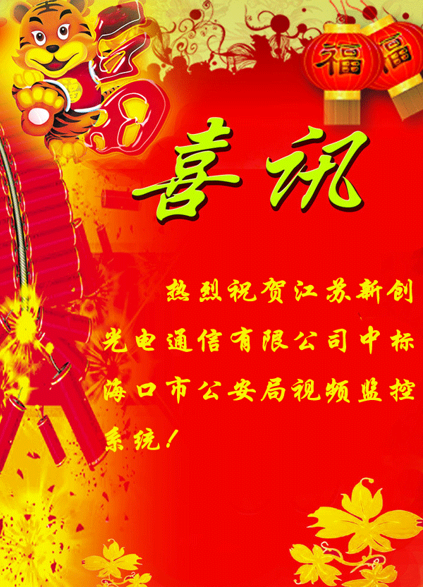 2010-02-28,江蘇新創(chuàng)中標并獲得海口市公安局視頻監(jiān)控系統(tǒng)500對光端機大單