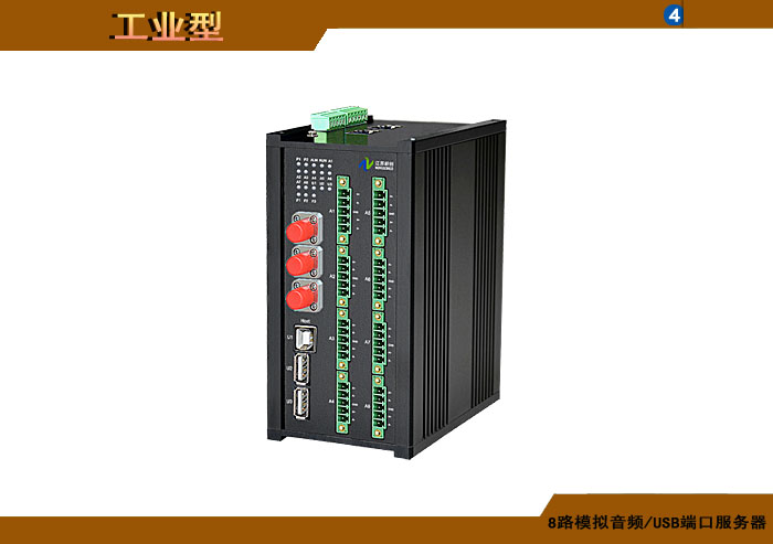 8路模擬音頻/USB光電端口服務器,卡儂/工業接線子/3.5mm/RCA接口,平衡/非平衡,立體聲/單聲道,1路USB主口輸入、可選多路下游口輸出,可選多路USB和模擬音頻電纜或光纖接口,可選內置數字隔離器,最大隔離電壓2500/5000Vrms,可選內置5/10KA浪涌保護器,獨立/冗余/總線供電(DC18~36V/5V),導軌,工業型 |