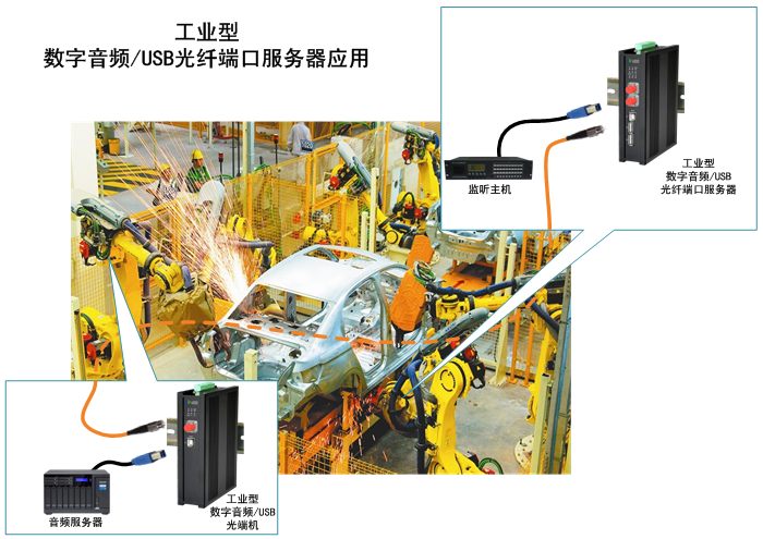 1/2/4/8/16路數字音頻/USB光纖端口服務器,1路USB主口輸入、可選多路下游口輸出,可選多路USB和數字音頻光纖接口,獨立/冗余/總線供電(DC18~36V/5V),導軌,工業型 |