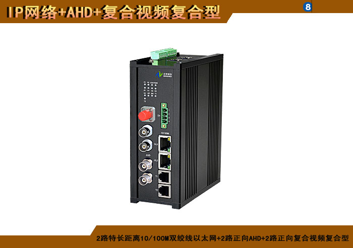 2路標準距離10/100M雙絞線以太網+2路正向AHD+2路正向復合視頻復合信號型光端機發射機/接收機,1/2/4/8擴容口可選,復合信號可選,單模/多模/塑料,1/2纖,ST/FC/SC/LC/SFP光接口,15/20/25/32dB,獨立/冗余/總線供電(DC18~36V/5V),導軌,工業型,非網管/網管/帶光纖數字診斷網管 |