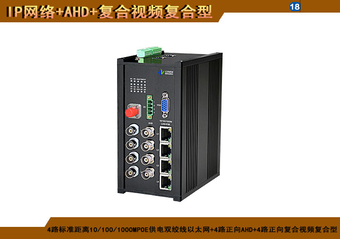 4路標準距離10/100/1000MPOE供電雙絞線以太網+4路正向AHD+4路正向復合視頻復合信號型光端機發射機/接收機,1/2/4/8擴容口可選,復合信號可選,單模/多模/塑料,1/2纖,ST/FC/SC/LC/SFP光接口,15/20/25/32dB,獨立/冗余/總線供電(DC18~36V/5V),導軌,工業型,非網管/網管/帶光纖數字診斷網管 |