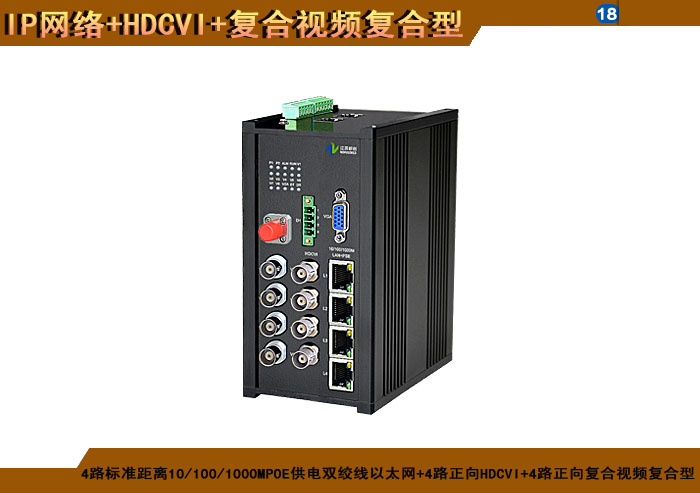 4路標(biāo)準(zhǔn)距離10/100/1000M雙絞線以太網(wǎng)+4路正向HDCVI+4路正向復(fù)合視頻復(fù)合信號(hào)型光端機(jī)發(fā)射機(jī)/接收機(jī),1/2/4/8擴(kuò)容口可選,復(fù)合信號(hào)可選,單模/多模/塑料,1/2纖,ST/FC/SC/LC/SFP光接口,15/20/25/32dB,獨(dú)立/冗余/總線供電(DC18~36V/5V),導(dǎo)軌,工業(yè)型,非網(wǎng)管/網(wǎng)管/帶光纖數(shù)字診斷網(wǎng)管 |