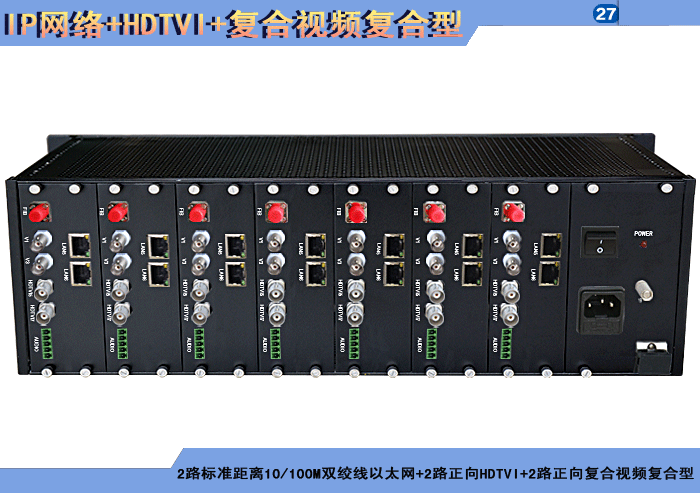 2路特長距離10/100M雙絞線以太網+2路正向HDTVI+2路正向復合視頻復合信號型光端機發射機/接收機,1/2/4/8擴容口可選,復合信號可選,單模/多模/塑料,1/2纖,ST/FC/SC/LC/SFP光接口,15/20/25/32dB,獨立/冗余/總線供電(DC18~36V/5V),導軌,工業型,非網管/網管/帶光纖數字診斷網管 |