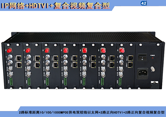 1/2/4路標準距離10/100MPOE供電雙絞線以太網+1/2/4路正向HDTVI+1/2/4路正向復合視頻復合信號型光端機發射機/接收機,復合信號可選,單模/多模/塑料,1/2纖,獨立/冗余供電,機架,高可靠型 |