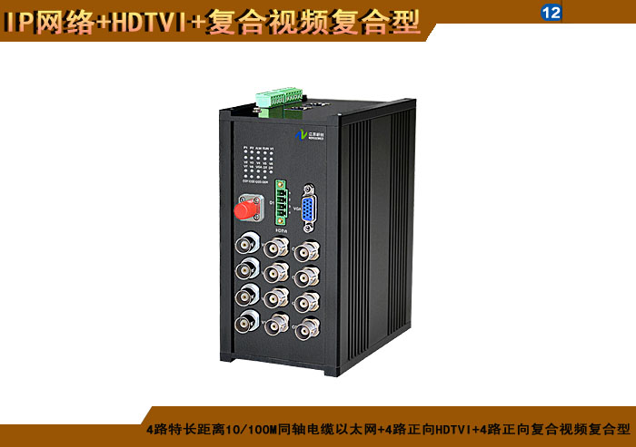 4路特長距離10/100M同軸電纜以太網+4路正向HDTVI+4路正向復合視頻復合信號型光端機發射機/接收機,1/2/4/8擴容口可選,復合信號可選,單模/多模/塑料,1/2纖,ST/FC/SC/LC/SFP光接口,15/20/25/32dB,獨立/冗余/總線供電(DC18~36V/5V),導軌,工業型,非網管/網管/帶光纖數字診斷網管 |