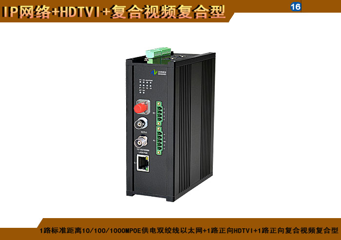 1路特長距離10/100MPOE供電雙絞線以太網+1路正向HDTVI+1路正向復合視頻復合信號型光端機發射機/接收機,1/2/4/8擴容口可選,復合信號可選,單模/多模/塑料,1/2纖,ST/FC/SC/LC/SFP光接口,15/20/25/32dB,獨立/冗余/總線供電(DC18~36V/5V),導軌,工業型,非網管/網管/帶光纖數字診斷網管 |