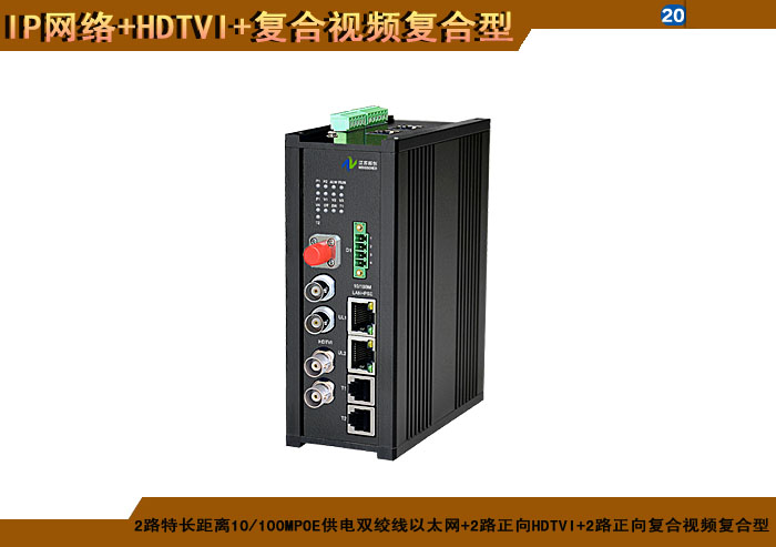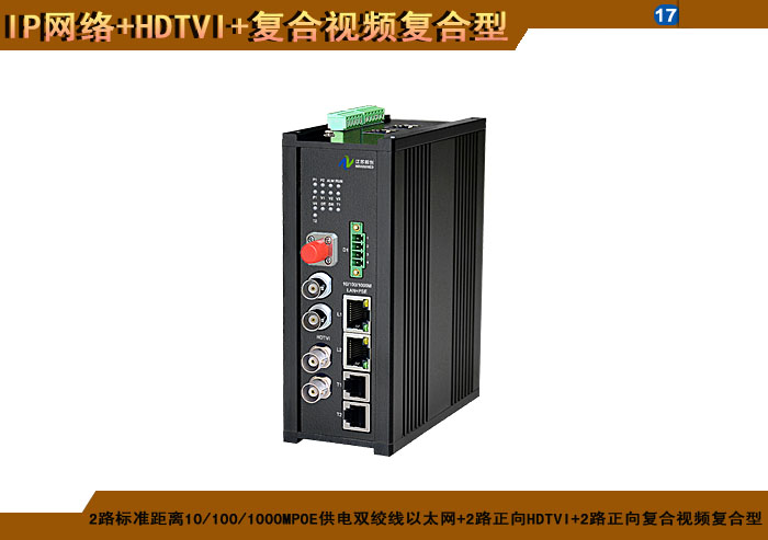2路標準距離10/100/1000M雙絞線以太網+2路正向HDTVI+2路正向復合視頻復合信號型光端機發射機/接收機,1/2/4/8擴容口可選,復合信號可選,單模/多模/塑料,1/2纖,ST/FC/SC/LC/SFP光接口,15/20/25/32dB,獨立/冗余/總線供電(DC18~36V/5V),導軌,工業型,非網管/網管/帶光纖數字診斷網管 |