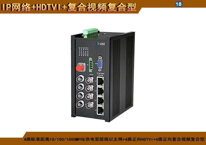 4路標準距離10/100/1000M雙絞線以太網+4路正向HDTVI+4路正向復合視頻復合信號型光端機發射機/接收機,1/2/4/8擴容口可選,復合信號可選,單模/多模/塑料,1/2纖,ST/FC/SC/LC/SFP光接口,15/20/25/32dB,獨立/冗余/總線供電(DC18~36V/5V),導軌,工業型,非網管/網管/帶光纖數字診斷網管 |