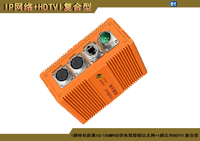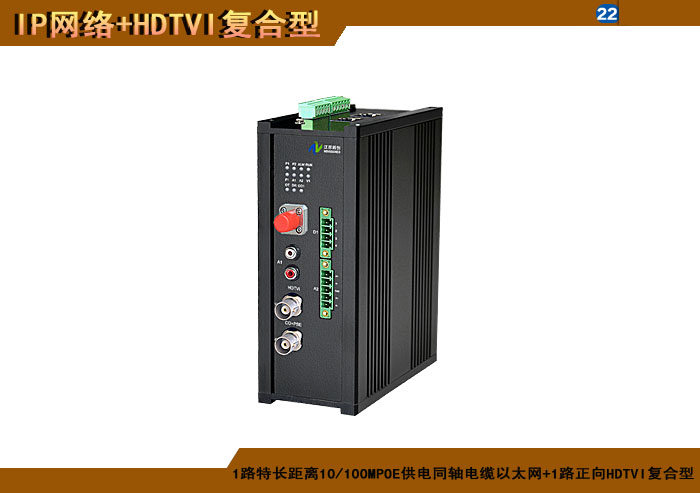 1路特長距離10/100MPOE供電雙絞線以太網+1路正向HDTVI復合信號型光端機發射機/接收機,1/2/4/8擴容口可選,復合信號可選,單模/多模/塑料,1/2纖,ST/FC/SC/LC/SFP光接口,15/20/25/32dB,獨立/冗余/總線供電(DC18~36V/5V),導軌,工業型,非網管/網管/帶光纖數字診斷網管 |
