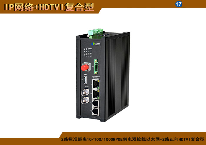 2路標準距離10/100MPOE供電雙絞線以太網+2路正向HDTVI復合信號型光端機發射機/接收機,1/2/4/8擴容口可選,復合信號可選,單模/多模/塑料,1/2纖,ST/FC/SC/LC/SFP光接口,15/20/25/32dB,獨立/冗余/總線供電(DC18~36V/5V),導軌,工業型,非網管/網管/帶光纖數字診斷網管 |