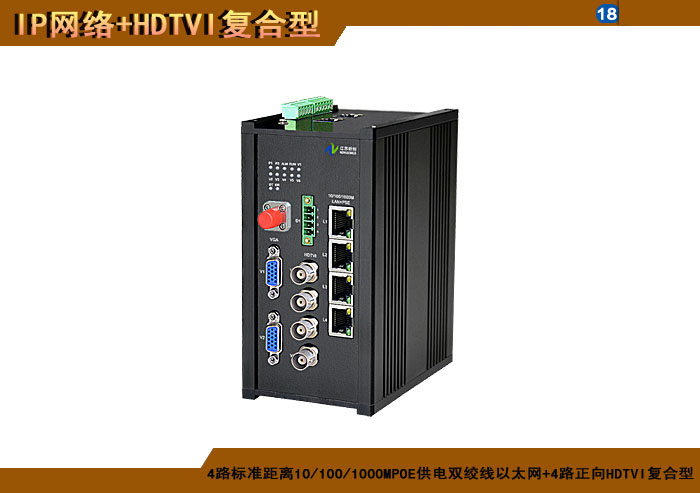 4路標準距離10/100MPOE供電雙絞線以太網+4路正向HDTVI復合信號型光端機發射機/接收機,1/2/4/8擴容口可選,復合信號可選,單模/多模/塑料,1/2纖,ST/FC/SC/LC/SFP光接口,15/20/25/32dB,獨立/冗余/總線供電(DC18~36V/5V),導軌,工業型,非網管/網管/帶光纖數字診斷網管 |