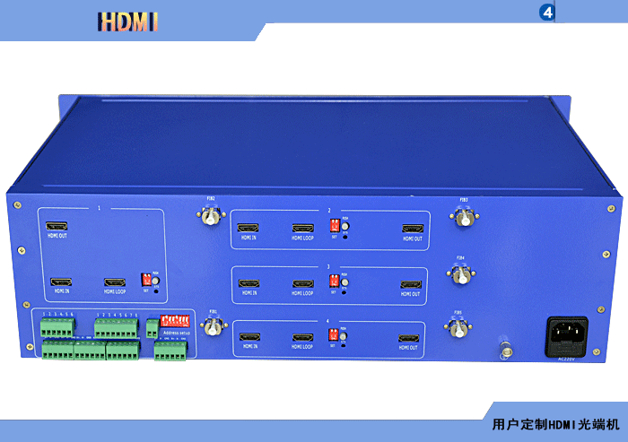 | 配置 | 4路HDMI高清視頻大屏顯示遠程輸出發射光端機,,模擬/數字音頻可選,單模/多模,1/2纖,ST/FC/SC/LC/SFP光接口,3U插卡,通用型,非網管/網管/帶光纖數字診斷網管 | ||