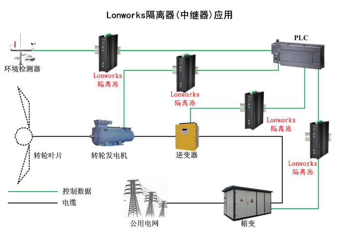 Lonworks隔離器(中繼器)已經廣泛應用在風力發電站現場和控制中心的塔座主控制器機柜、機艙控制站機柜、變槳距系統、變流器系統、大功率變流器通訊 偏航系統、發電機系統、液壓系統、增速齒輪箱系統、氣象系統、現場觸摸屏站、升壓站、開關柜、風機控制、保護和測控柜、繼電和配電保護裝置、各種傳感器和檢測系統、視頻監控云臺及報警控制、消防系統、以及各種現場遙控、遙測、遙信自動控制和監測裝置中。