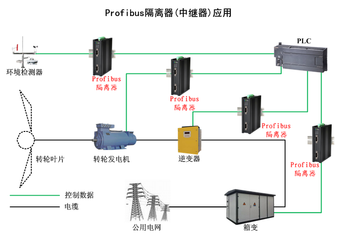 Profibus隔離器(中繼器)已經廣泛應用在風力發電站現場和控制中心的塔座主控制器機柜、機艙控制站機柜、變槳距系統、變流器系統、大功率變流器通訊 偏航系統、發電機系統、液壓系統、增速齒輪箱系統、氣象系統、現場觸摸屏站、升壓站、開關柜、風機控制、保護和測控柜、繼電和配電保護裝置、各種傳感器和檢測系統、視頻監控云臺及報警控制、消防系統、以及各種現場遙控、遙測、遙信自動控制和監測裝置中。
