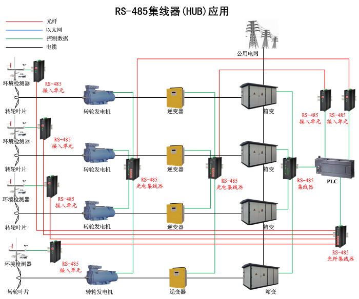 RS-485集線器(HUB)已經廣泛應用在風力發電站現場和控制中心的塔座主控制器機柜、機艙控制站機柜、變槳距系統、變流器系統、大功率變流器通訊 偏航系統、發電機系統、液壓系統、增速齒輪箱系統、氣象系統、現場觸摸屏站、升壓站、開關柜、風機控制、保護和測控柜、繼電和配電保護裝置、各種傳感器和檢測系統、視頻監控云臺及報警控制、消防系統、以及各種現場遙控、遙測、遙信自動控制和監測裝置中。