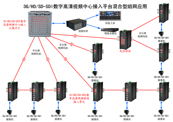 3G/HD/SD-SDI高清數字視頻中心接入匯聚卡與前端接入單元可構成多個點對點、總線、無源PON、星型匯聚等自愈備份或冗余備份光纖構建和延伸高可靠、大地理范圍、分布式扁平化的3G/HD/SD-SDI高清數字視頻監控及通信網絡。