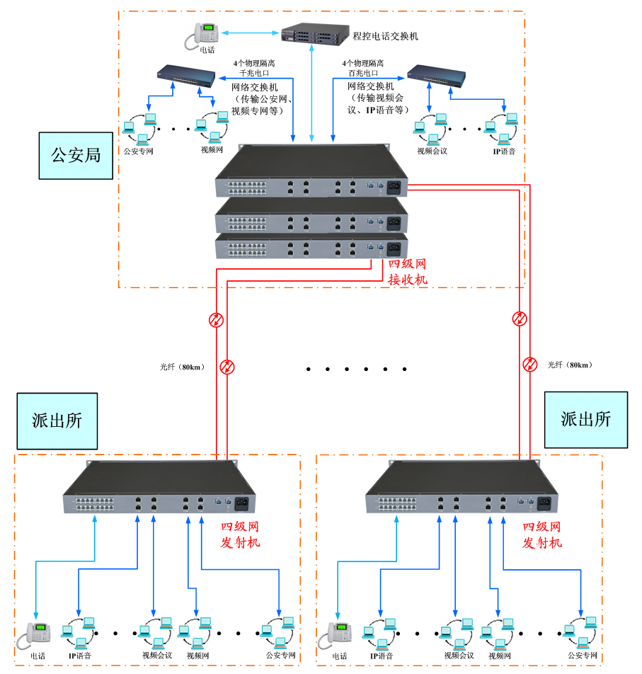 公安三四級網前端接入單元采用高速傳輸光通信技術、視音頻圖像處理、高速網絡、電信語音及復用技術,將公安內部網及行政信息網的多路百兆/千兆/萬兆以太網、公安三四級網的治安監控多路圖像信號及控制數據、會議電視的視音頻數據信號、用于語音電話通信及其它電信業務的多路E1/G.703等2M基本速率接口、局內電話交換機/分機系統、交通卡口控制信號及圖像視音頻信號、交通電子警察、流量檢測多種綜合業務整合在單芯光纖上無失真、高質量傳輸,實現派出所、交通卡口、公安下屬分支機構與各分局、市局遠距離聯網通信。