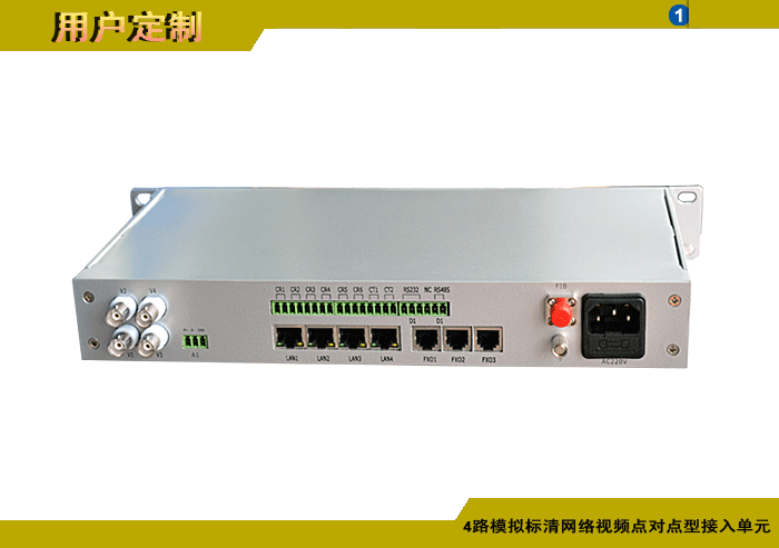 4路模擬標清網絡視頻交通信息點對點型接入單元,1光2電百兆/千兆以太網接口,多路RS-232/485/422/IO開關量可選,1路雙向音頻可選,單模/多模/塑料,獨立供電,機架,通用型 |