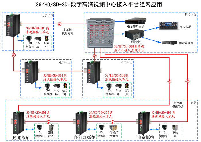 3G/HD/SD-SDI高清數字視頻交通信息中心接入匯聚卡與前端接入單元可構成多個點對點、總線、無源PON、星型匯聚等自愈備份或冗余備份光纖構建和延伸高可靠、大地理范圍、分布式扁平化的3G/HD/SD-SDI高清數字視頻監控及通信網絡。
