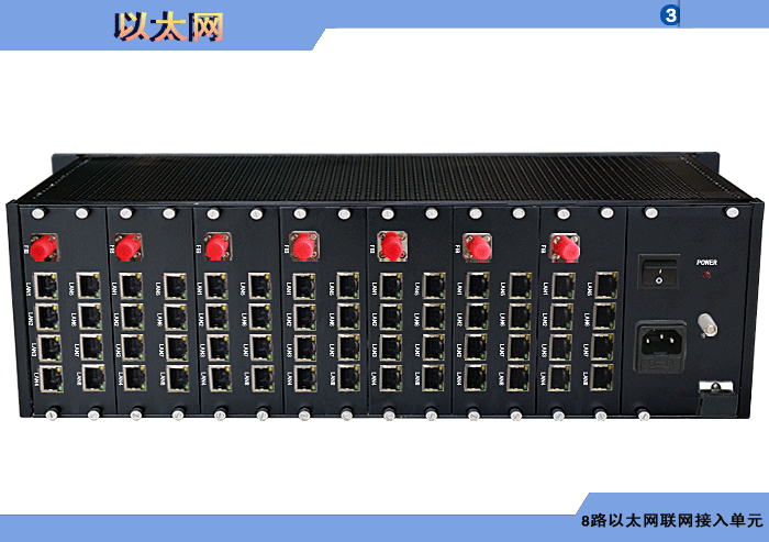 視頻會議終端以太網聯網接入單元發射機/接收機,8路10/100M以太網,數據/電話可選,單模/多模/塑料,1/2纖,ST/FC/SC/LC/SFP光接口,15/20/25/32dB,獨立/冗余供電,3U插卡,通用/車載型,非網管/網管/帶光纖數字診斷網管 |