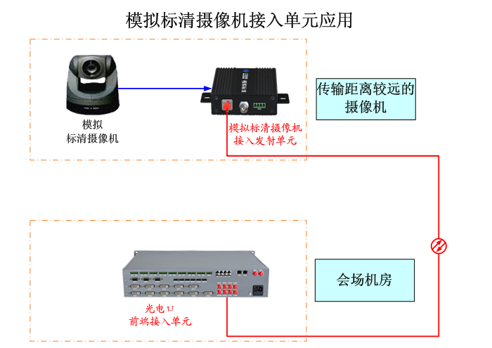 模擬標清攝像機接入單元支持標清視頻會議系統的模擬標清攝像機信號通過光纖長距離傳輸到主控機房、會議中心主控室與矩陣或標清視頻會議終端相連接。使用本接入單元將標清攝像機通過光纖遠程接入中心的標清視頻會議系統,這樣很多小型會議室或遠程會議室就不需要設置控制室和放置會議終端。通過接入單元與標清矩陣相配合,單臺標清視頻會議終端可以給多個會議室使用,大大提高了標清視頻會議終端的使用效率,節省了標清視頻會議設備的昂貴投資。接入單元自動支持PAL、NTSC、SECAM制式的高標清視頻。