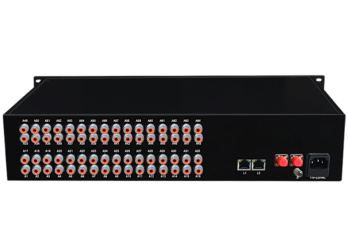 64路數字音頻網關總線級聯型接入單元,2光2電百兆/千兆以太網接口,多路控制數據/報警開關量可選,單模/多模/塑料,1/2纖,ST/FC/SC/LC/SFP光接口,15/20/25/32dB,獨立/冗余供電,2U機架,通用型 |