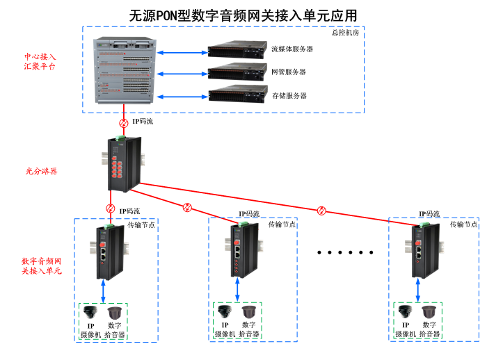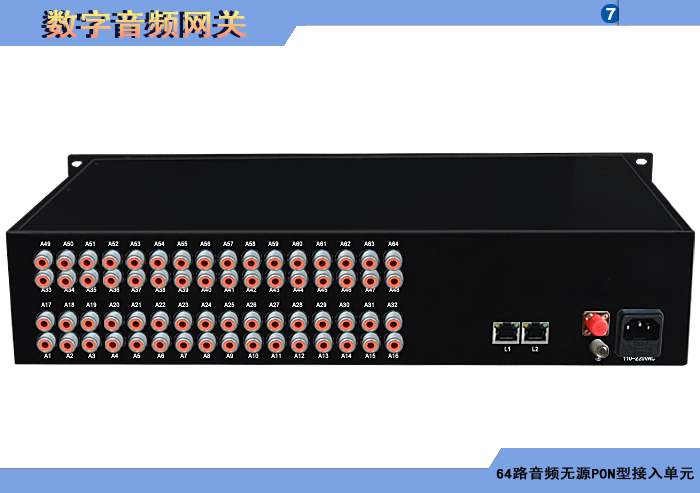 64路數字音頻網關無源PON型接入單元,1光2電百兆/千兆以太網接口,多路控制數據/報警開關量可選,單模/多模/塑料,1/2纖,ST/FC/SC/LC/SFP光接口,15/20/25/32dB,獨立/冗余供電,2U機架,通用型 |