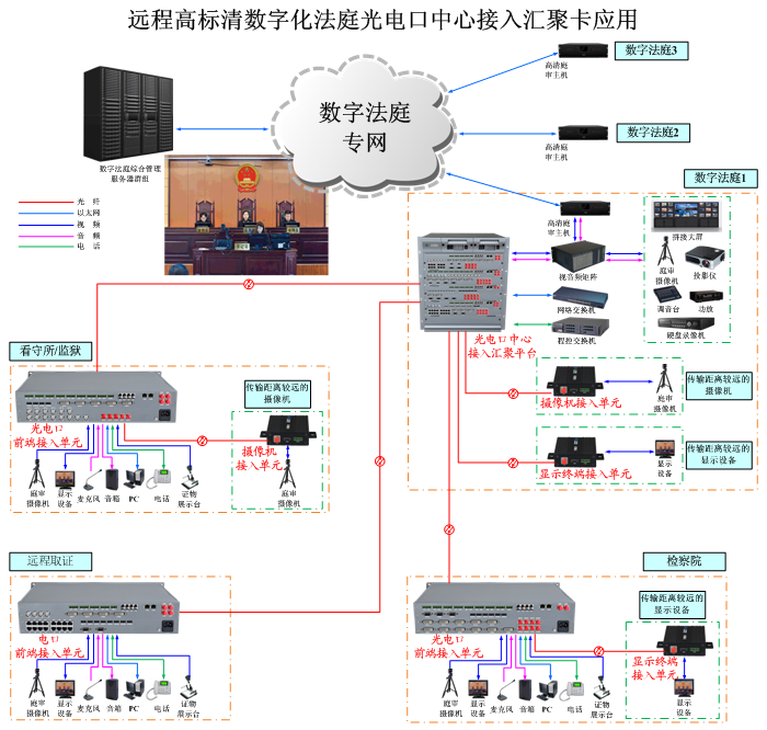 遠程高標清數字化法庭系統光電口中心接入匯聚卡已經廣泛應用在各級人民法院數字化法庭、高清庭審、審判高清直播、遠程法庭、現場公審、聯合辦案、遠程會審、現場案件執法等數字化高清圖像顯示、庭審錄制、直播和會議系統中。