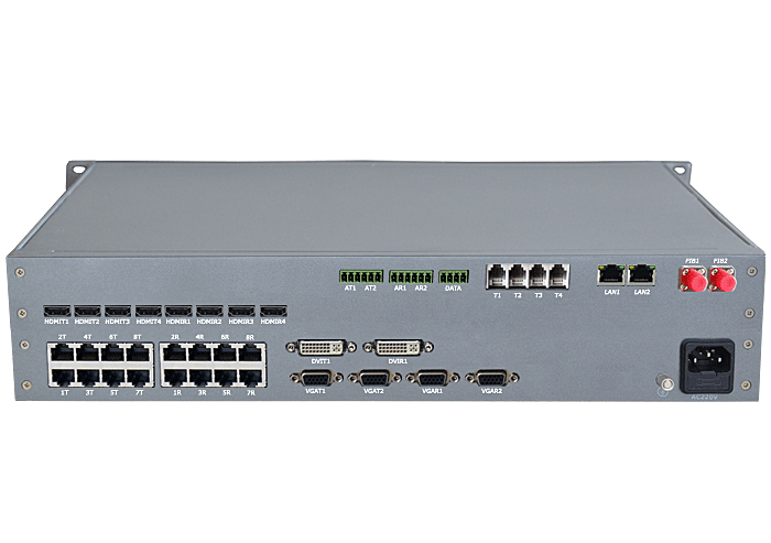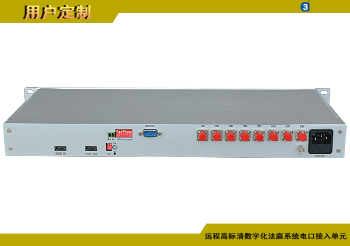 遠程高標清數字化法庭系統電口接入單元,1/2/4/8路DVI顯示屏電口輸出,1/2/4/8路模擬/數字雙向立體聲音頻可選,1/2/4/8路可選數據,多路電話或百兆/千兆以太網可選,單模/多模,獨立/冗余供電,2U機架,非網管/網管/帶光纖數字診斷網管 |