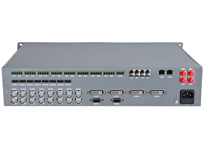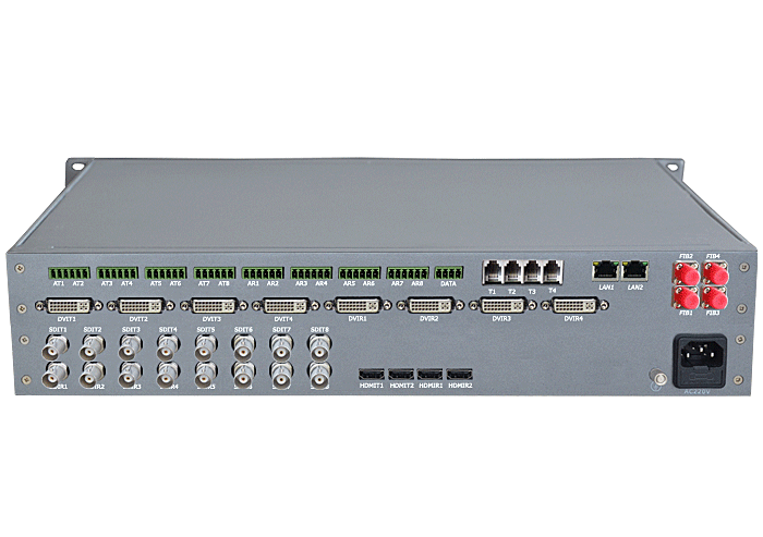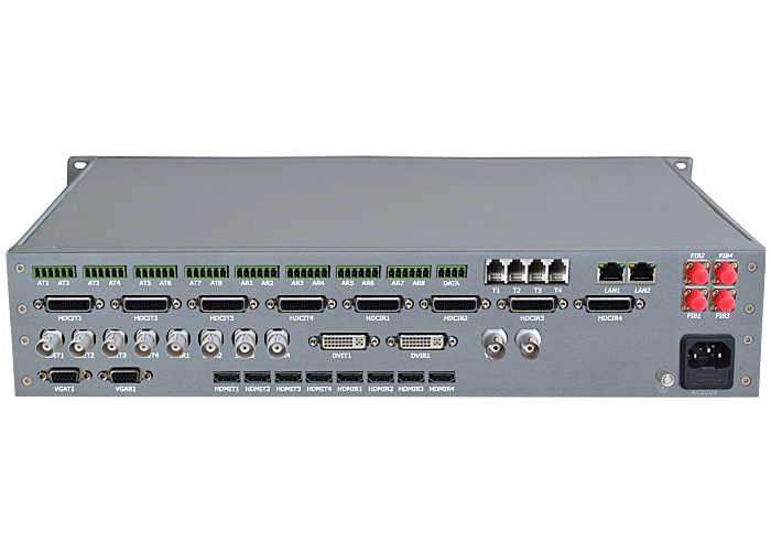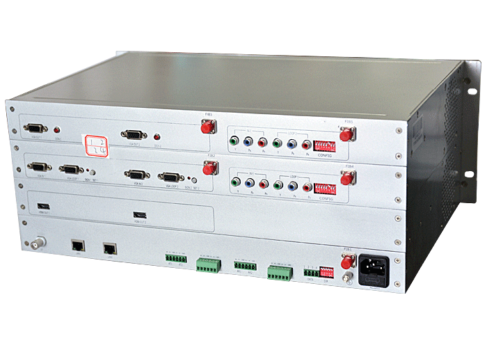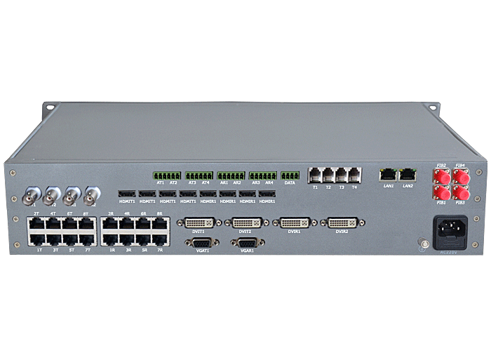 遠程高標清數字化法庭系統電口接入單元,1/2/4/8路HDMI/VGA/YPbPr/模擬標清視頻攝像機電口輸入,1/2/4/8路HDMI/VGA/YPbPr/模擬標清視頻顯示屏電口輸出,1/2/4/8路模擬/數字雙向立體聲音頻可選,1/2/4/8路可選數據,多路電話或百兆/千兆以太網可選,單模/多模,獨立供電,4U機架,非網管/網管/帶光纖數字診斷網管 |