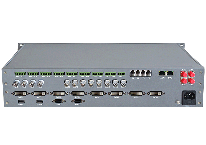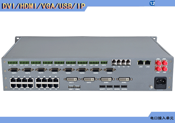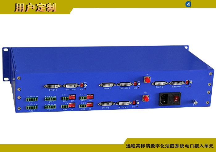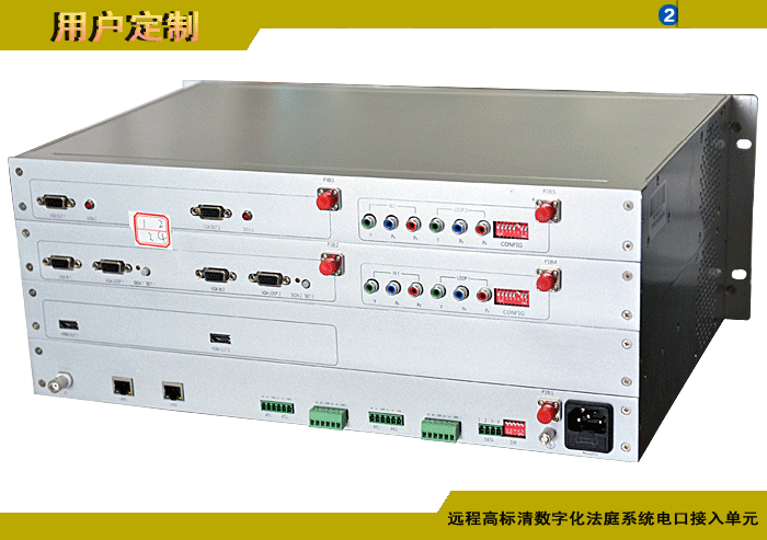 遠程高標清數字化法庭系統電口接入單元,1/2/4/8路DVI/HDMI/DP/VGA/YPbPr攝像機電口輸入,1/2/4/8路DVI/HDMI/DP/VGA/YPbPr顯示屏電口輸出,1/2/4/8路模擬/數字雙向立體聲音頻可選,1/2/4/8路可選數據,多路電話或百兆/千兆以太網可選,單模/多模,獨立/冗余供電,1/2/3/4U機架,非網管/網管/帶光纖數字診斷網管 |