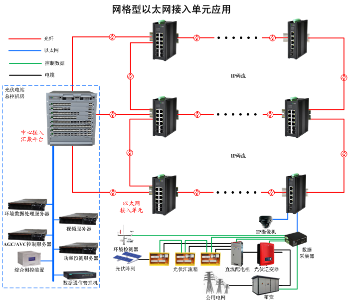 以太網網格型接入單元已經廣泛應用在光伏太陽能發電站現場和控制中心的匯流箱、直流配電柜、逆變器、交流配電柜、箱式和房式變壓系統、電能計量系統、環境和氣候監測儀、數據采集器、通信控制機、視頻監控云臺及報警控制、消防系統、風機系統、各種保護和開關裝置、RTU及配電裝置、以及各種現場遙控、遙測、遙信自動控制和監測裝置中。