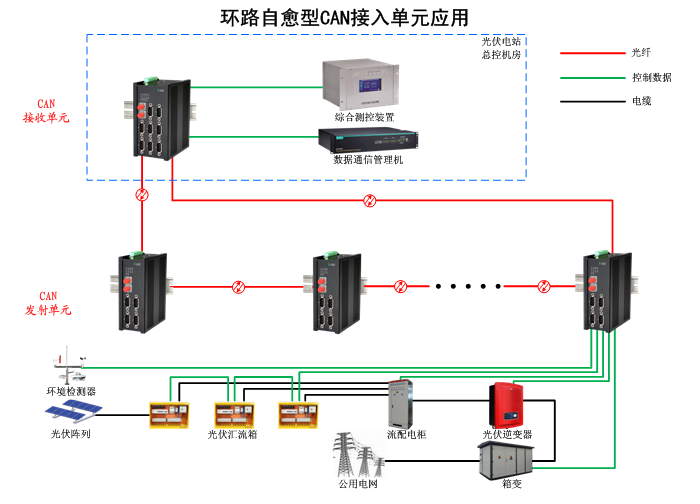 CAN環路自愈型接入單元是江蘇新創自主研發創新,專門為太陽能光伏電站匯流箱、逆變器、直流配電柜、交流配電柜、氣象監測儀、環境檢測儀、房式或箱式變升壓系統、數據采集器、電度表、電量計量儀、風機控制、保護和測控柜、繼電和配電保護裝置、各種傳感器和檢測系統、編碼器、變頻器、伺服器、執行器設備輸出的CAN信號進行調理如隔離放大、濾波和降噪、隔離、光纖轉換、傳輸和供電配電而設計。