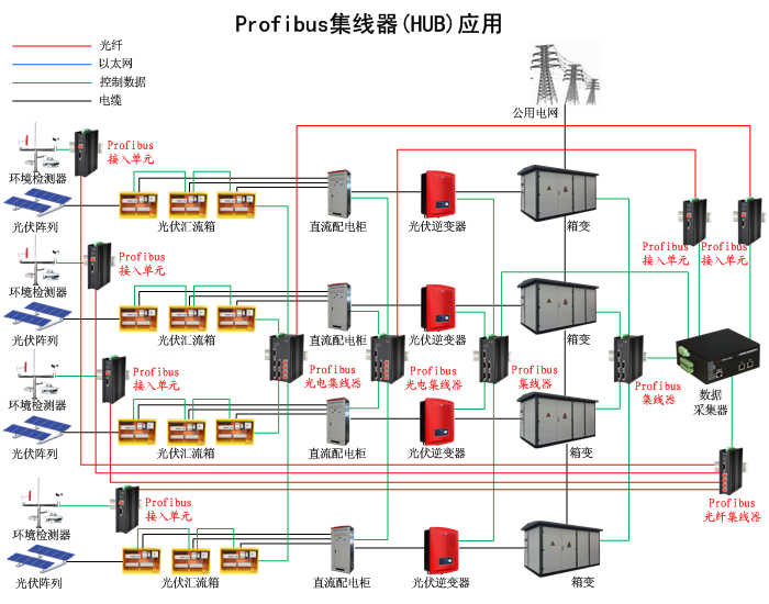 Profibus集線器(HUB)已經(jīng)廣泛應用在光伏太陽能發(fā)電站現(xiàn)場和控制中心的匯流箱、直流配電柜、逆變器、交流配電柜、箱式和房式變壓系統(tǒng)、電能計量系統(tǒng)、環(huán)境和氣候監(jiān)測儀、數(shù)據(jù)采集器、通信控制機、視頻監(jiān)控云臺及報警控制、消防系統(tǒng)、風機系統(tǒng)、各種保護和開關裝置、RTU及配電裝置、以及各種現(xiàn)場遙控、遙測、遙信自動控制和監(jiān)測裝置中。