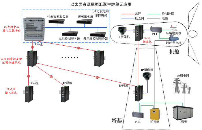 以太網有源星型匯聚中繼單元已經廣泛應用在風力發電站現場和控制中心的塔座主控制器機柜、機艙控制站機柜、變槳距系統、變流器系統、大功率變流器通訊 偏航系統、發電機系統、液壓系統、增速齒輪箱系統、氣象系統、現場觸摸屏站、升壓站、開關柜、風機控制、保護和測控柜、繼電和配電保護裝置、各種傳感器和檢測系統、視頻監控云臺及報警控制、消防系統、以及各種現場遙控、遙測、遙信自動控制和監測裝置中。