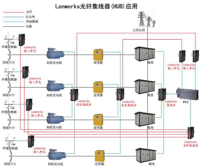 Lonworks集線器(HUB)已經(jīng)廣泛應(yīng)用在風力發(fā)電站現(xiàn)場和控制中心的塔座主控制器機柜、機艙控制站機柜、變槳距系統(tǒng)、變流器系統(tǒng)、大功率變流器通訊 偏航系統(tǒng)、發(fā)電機系統(tǒng)、液壓系統(tǒng)、增速齒輪箱系統(tǒng)、氣象系統(tǒng)、現(xiàn)場觸摸屏站、升壓站、開關(guān)柜、風機控制、保護和測控柜、繼電和配電保護裝置、各種傳感器和檢測系統(tǒng)、視頻監(jiān)控云臺及報警控制、消防系統(tǒng)、以及各種現(xiàn)場遙控、遙測、遙信自動控制和監(jiān)測裝置中。