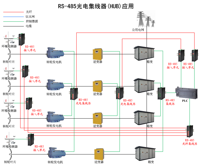 RS-485光電集線器(HUB)已經廣泛應用在風力發電站現場和控制中心的塔座主控制器機柜、機艙控制站機柜、變槳距系統、變流器系統、大功率變流器通訊 偏航系統、發電機系統、液壓系統、增速齒輪箱系統、氣象系統、現場觸摸屏站、升壓站、開關柜、風機控制、保護和測控柜、繼電和配電保護裝置、各種傳感器和檢測系統、視頻監控云臺及報警控制、消防系統、以及各種現場遙控、遙測、遙信自動控制和監測裝置中。