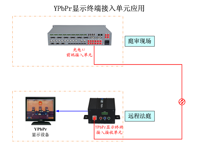 YPbPr顯示終端接入單元已經廣泛應用在各級人民法院數字化法庭、高清庭審、審判高清直播、遠程法庭、現場公審、聯合辦案、遠程會審、現場案件執法等數字化高清圖像顯示、庭審錄制、直播和會議系統中。