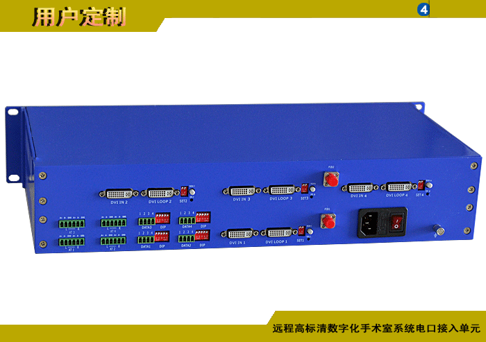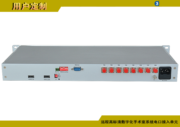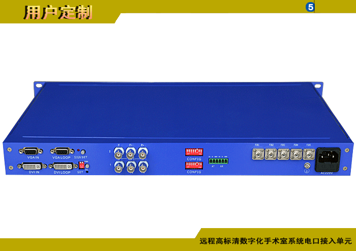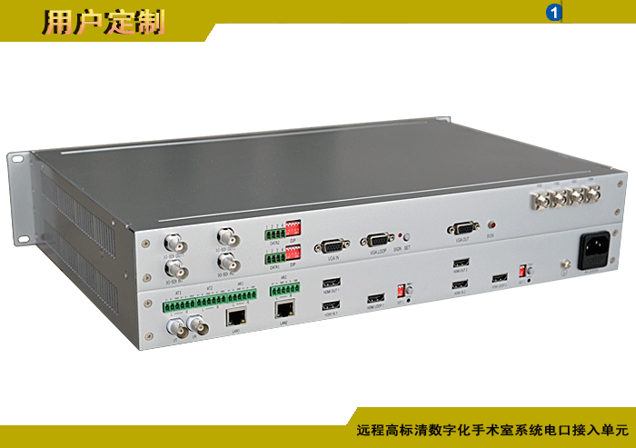 遠(yuǎn)程高標(biāo)清數(shù)字化手術(shù)室系統(tǒng)電口接入單元,1/2/4/8路DVI/HDMI/DP/VGA/YPbPr攝像機(jī)電口輸入,1/2/4/8路DVI/HDMI/DP/VGA/YPbPr顯示屏電口輸出,1/2/4/8路模擬/數(shù)字雙向立體聲音頻可選,1/2/4/8路可選數(shù)據(jù),多路電話(huà)或百兆/千兆以太網(wǎng)可選,單模/多模,獨(dú)立/冗余供電,1/2/3/4U機(jī)架,非網(wǎng)管/網(wǎng)管/帶光纖數(shù)字診斷網(wǎng)管 |
