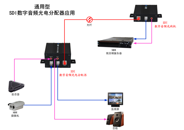 3G/HD/SD-SDI數字音頻光電分配器支持AES/EBU、S/PDIF及光纖數字音頻接口,內置電纜自動均衡器和時鐘重定時功能,因此大大降低及保證了輸出波形失真和數字信號抖動的要求,提高了輸入輸出信號質量。