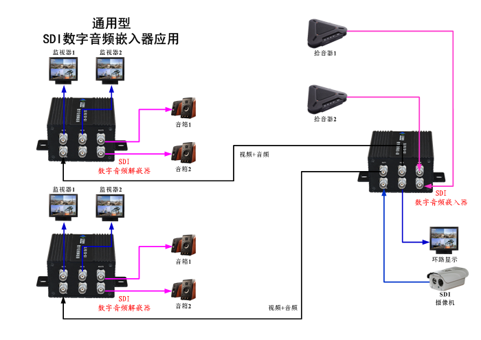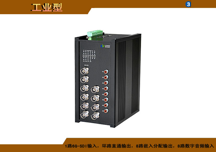數(shù)字音頻6G-SDI嵌入器,1路6G-SDI輸入,環(huán)路直通輸出,2/4/8路嵌入分配輸出,2/4/8路數(shù)字音頻卡儂/BNC/RCA/光纖接口輸入,獨(dú)立/冗余供電,壁掛/機(jī)架,防水型 |