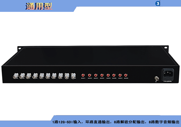 數字音頻12G-SDI解嵌器,1路12G-SDI輸入,環路直通輸出,8路解嵌分配輸出,8路數字音頻卡儂/BNC/RCA/光纖接口輸出,獨立/冗余供電,機架,通用型 |