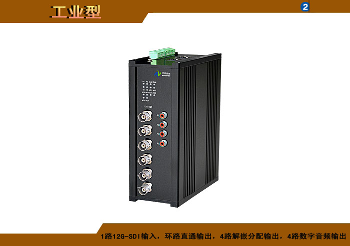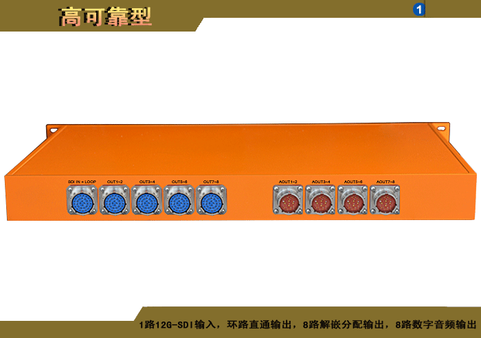 數字音頻12G-SDI解嵌器,1路12G-SDI輸入,環路直通輸出,2/4/8路解嵌分配輸出,2/4/8路數字音頻卡儂/BNC/RCA/光纖接口輸出,獨立/冗余供電,壁掛/機架,防水型 |