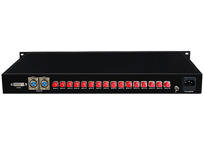 1進16出DVI模擬音頻光纖分配器,內置數字均衡器/抖動去除器可選,卡儂/端子/3.5mm/RCA接口,獨立/冗余供電,壁掛,通用型 |