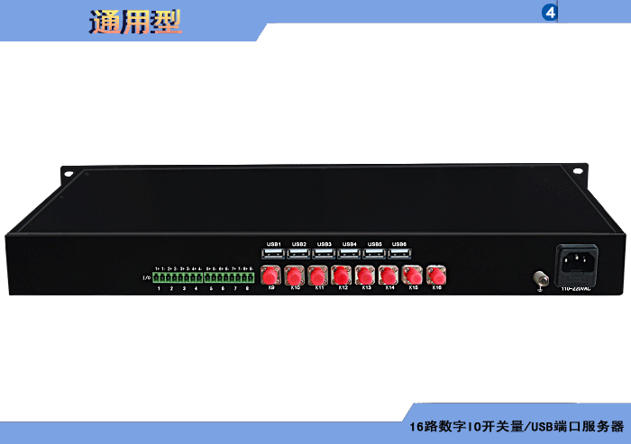 配置 16路數字IO開關量/USB光電端口服務器,1路USB主口輸入、可選多路下游口輸出,可選多路USB和數字IO開關量電纜或光纖接口,可選內置數字隔離器,最大隔離電壓2500/5000Vrms,可選內置5/10KA浪涌保護器,獨立/冗余/總線供電(DC18~36V/5V),壁掛/插卡/機架,通用型