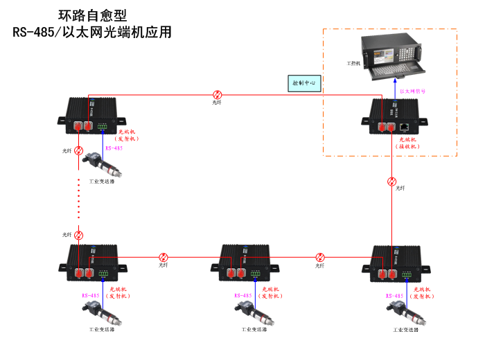 RS-485/以太網環路自愈型光端機發射機,1 路RS-485,單模/多模/塑料,2路光口,ST/FC/SC/LC/SFP光接口,15/20/25/32dB,獨立/冗余/總線供電(DC18~36V/5V),導軌,工業型,非網管/網管/帶光纖數字診斷網管 |