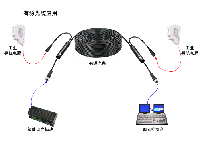 DMX512有源光纜AOC/光纖導(dǎo)線支持5V或24V(18~36V)直流電源輸入設(shè)計,也可通過有源光纜中電纜混合的方式遠(yuǎn)距離供電。